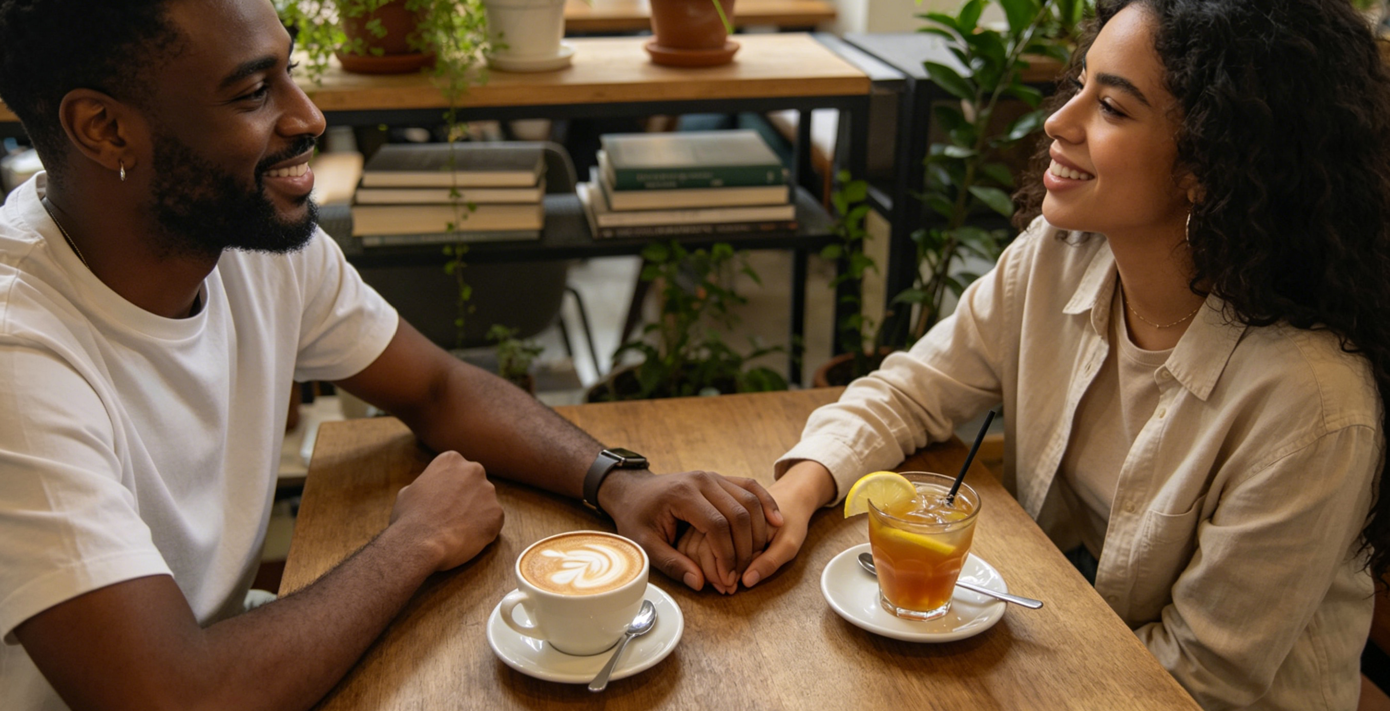A close-up shot of two people from different ethnic backgrounds holding hands across a café table with two different types of coffee/tea.